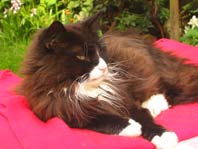 Das Hüpfen wurde stärker, Cheyenne wurde einige Male hoch und runter geschaukelt. Wir sahen ganz fasziniert zu und erwarteten eigentlich, dass Cheyenne jeden Moment mehr als sauer reagiert und dem Gewühle ein Ende setzt. Aber nein, er blieb tapfer auf seinem gemütlichen Schlafplatz liegen. Und dann, plötzlich ein recht energisches Wühlen von Tjoffy und der Kleine Mann purzelte seitlich von der Liege. Und vier dicke weiße Pfoten hingen in der Luft. Oje, dachten wir, jetzt geht es los!!! Gleich gibt es mächtig haue für Tjoffy. Aber nein, Cheyenne saß völlig verdattert auf dem Rasen, guckte Tjoffy verwirrt an .... “was machst du bloß???“... und trollte sich davon zu einem ruhigeren Plätzchen. Wir mussten denn doch lachen und kamen zu dem Schluss: Tja, DAS ist wahre Katerfreundschaft!!! |