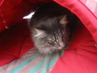 Obwohl Finn und Fritjof inzwischen Cheyenne an Größe weit überragten, tat das der Freundschaft der drei Kater keinen Abbruch. Beim kuscheln begrub zwar Finn Cheyenne fast unter sich und auch bei Tjoffy blieb dem kleinen Mann nicht viel Platz zum Liegen, aber wenn es Cheyenne zu eng wurde, ging er einfach und überließ seinen Freunden den Platz. An einem heißen Sommerabend saßen wir auf der Terrasse. Finn und Tjoffy lagen entweder träge in oder auf ihren Kartons, Baschi hatte sich auf der Gartenbank lang gemacht und Cheyenne lag auf der Sonnenliege im Schatten und schlief entspannt. Tjoffy wurde es offenbar doch zu langweilig und er beschloss, dem Abhilfe zu schaffen. Erst guckte er hier und da und ging dann in Richtung Cheyennes Liege. Umgehend versuchte er sich zwischen Auflage und Liege zu wühlen. Die Auflage hüpfte nur so und mit ihr auch der schlafende Cheyenne.