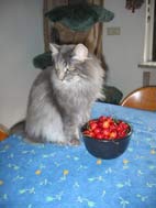Jeder, der Katzen hat, kennt gewisse Rituale, die eingehalten werden müssen. So erwarten es die Pelze nun mal. Und man möchte ja ein guter Mitbewohner sein oder eben ein gutes Personal. Abgesehen davon, wird man ja immer sehr nett gefragt. Cheyenne möchte sein Futter bitte schön auf der Arbeitsplatte bekommen! Baschi möchte vor dem Futtern bitte schön einige Male freundlichst gestreichelt werden. Finn bringt nach wie vor seinen Pröll vom Schlafzimmer nach unten, möchte gelobt werden und seine kleinen grauen Spielmäuse, die bringt er auch immer brav aus dem Keller mit. Tja und Tjof??? Der verlangt nach wie vor direkt wenn das Licht im Schlafzimmer abends ausgeht, seine Stängchen. Aber er macht es jetzt sehr liebevoll. Tupft mir der Pfote auf mein Gesicht und ich hole dann schnellstens ein Stängchen hervor. Aber Tjoffy möchte auch seine Katzentabs und anderes Leckerli NUR auf dem Küchentisch! Vergeblich haben wir versucht, erzieherisch auf ihn einzuwirken. Nein, nicht auf dem Boden, nein nur auf dem Tisch bitte, Und nicht einfach hinlegen. Das Tabs muss auf dem Deckel der verschlossenen Dose liegen. Anschließend wird die Dose schwungvoll mit der Pfote angestoßen und umgeworfen. Peng!“! Bitte nocheins. Natürlich kann man nichts machen ohne das Finn und Fritjof ihre kleinen Nasen dabei haben müssen…was machst du da?? Können wir helfen? So auch. als ich letztens das Trockenfutter in die Vorratsdose umfüllen wollte. Finn und Tjof standen schon auf dem Tisch als ich die 2 Kilo Tüte öffnete und aufschnitt. Hmmmm…riecht aber lecker. Da fühlte ich mich schon wieder so als ob ich den Pelznasen nur altes Futter geben würde. Ungeduldig umkreisten beide die Tüte. Ja ..gleich ... erst umfüllen. Dose auf dem Tisch und den Inhalt der Tüte reingeschüttet. Wie immer, versuchten Beide aus der geöffneten Dose zu futtern. DAS schmeckt ja viel besser als aus dem Napf!!! Ich kannte das schon und ließ die Beiden gewähren. Die Tüte war noch nicht leer und ich suchte in der Schublade nach der Klammer. Da hörte ich ein lautes Peng!!! Dann noch ein ganz leises aber heftig rieseln. NEIN!!! Was habt ihr gemacht?? Tjoffy war es zu mühsam geworden, das Futter aus der Dose zu holen und hatte kurzerhand mit der Pfote die große Dose umgeschubst. Die kleinen Körner lagen verstreut auf dem Tisch, aber fast anderthalb Kilo Trockenfutterteile waren großflächig über den Boden verteilt. Überall lag das Futter. Verständnislos sahen sie, wie ich das Futter vom Tisch wieder in die Dose klaubte. Aber da lagen ja noch jede Menge!!! Futterteile auf dem Boden. Nix wie drauf gestürzt und dann saßen die beiden Kerle da und schmausten !! Während ich mit dem Besen da stand und eigentlich gerne gefegt hätte.