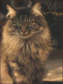 bemühen. Wo ist Cheyenne? Cheyenne tobte auf dem Garagendach unseres Nachbarn herum und machte die Fete seines Lebens. Sammy, Peewee und damals auch Flori hatten sich unter dem Feuerdorn versammelt. Ich alarmierte meinen Mann. Ganz ruhig bleiben, keine Panik verbreiten und die Nerven behalten. Wir standen im Bademantel und Gummistiefel (es war Februar und kalt und nass) auf der Leiter , lockten mit Roastbeef und allerlei ausgewählten Dingen. Nichts! Cheyenne verschwand und tauchte wieder auf. Er raste mit einer irrsinnigen Geschwindigkeit auf dem Dach herum. Dann, endlich nach anderthalb Stunden hatten wir den Ausreißer wieder. Von seinen pelzigen Freunden wurde er nicht sehr freundlich empfangen. Das Ergebnis dieses Ausflugs war, unser Feuerdorn hat jetzt die Größe eines Bonsais und wir waren den ganzen Tag mit der Schneiderei beschäftigt. Sehr zum Missfallen Cheyennes. Vorsichtshalber verpassten wir der Mauer noch ein Dach aus Katzennetz. Er versuchte am gleichen Tag nochmals den Dornenstrauch zu bezwingen. Aber dieser Fete hatten wir ein gründliches Ende bereitet. Aber wie ich schon oft festgestellt habe, diese verflixte Norwegerbande hat einen umwerfenden Charme und sie folgen ja nur ihrem Temperament. Und : diese liebevollen Gesellen können, wenn ich kleine Nasenküsse bekomme, fast alles von mir haben. Aber nur fast. Zum Schluss an alle Leser liebe Grüße
