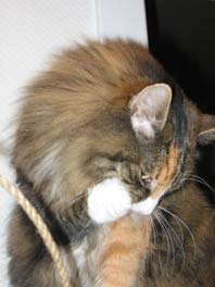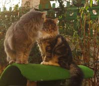 Im Laufe der Zeit war die Klappermaus nur noch ein Fragment ihrer selbst aber Baschi liebte sie immer noch. Es ging anderthalb Jahre gut. Dann war die Maus verschwunden. Wir suchten wochenlang alles in der Wohnung und im Garten ab. Immer stand Baschi dabei mit hoffnungsvollen Blick: Haste die Maus gefunden? Wir boten Baschi die anderen Mäuse an. NEIN, mit denen spiel ich nicht!! Baschi spielte überhaupt nicht mehr. Madamchen übte mächtig Druck aus, die Sucherei im Haus wurde allmählich zur Manie bei uns. Baschi weigerte sich überhaupt zu spielen. Es war zum verzweifeln. Hol doch ein paar neue weiße Mäuse, vielleicht klappern noch andere genauso meinte Nick. Ja gut seufzte ich mit wenig Hoffnung auf Erfolg. Offenbar hatte diese eine Klappermaus ein einzigartiges klappern. Im Katzenladen kam der Besitzer auf mich zu. Er sprach immer mit einem ausgeprägten Dialekt und sagte freudig: Tach Frau dääää Bröööin, was kann ich für Sie tun? Ach ja, weiße Mäuse, die klappern. Er kannte wohl das Problem. Ein ganzer Kasten voll mit weißen Mäusen , wurde von uns geprüft. Wir rappelten und schüttelten die Mäuse. Hörten mit leicht schräg geneigten Kopf ob das klappern identisch mit der EINEN Maus war. Nein, keine dabei, ich habe noch mehr und eilte diensteifrig ins Lager. Wir schüttelten weiter Mäuse ...irgendwann musste ich innerlich lachen. Da standen zwei ausgewachsenen Menschen, rüttelten Mäuse um den Klang zu prüfen. Kurz entschlossen nahm ich 6 ausgewählte Exemplare mit. Guck mal Baschi, eine feie weiße Klappermaus. Baschi prüfte die Mäuse, spielte einmal damit, wir sahen uns schon auf der Gewinnerseite ... NEIN. Mit denen spiele ich nicht. Sie ging und ließ uns mit den Mäusen einfach dumm stehen. Irgendwann erklärte Madamchen anderes Spielzeug zu ihrem "Heiligtum". Aber es war nie wieder so ein Spiel mit ihr möglich wie mit dieser weißen Klappermaus. Im Spätsommer 2004 zogen Finn und Fritjof ein. Mein Mann war der festen Überzeugung, Baschi wird sofort mit den Kleinen spielen. Ich hatte da so meine Zweifel.