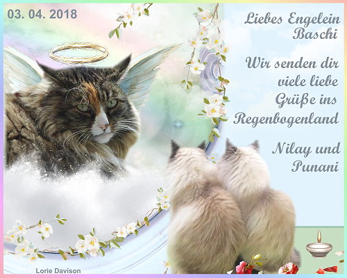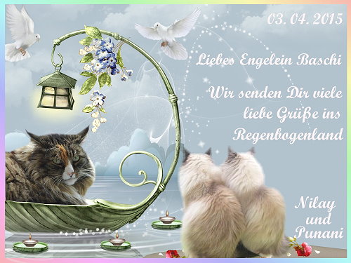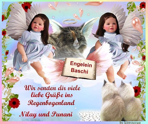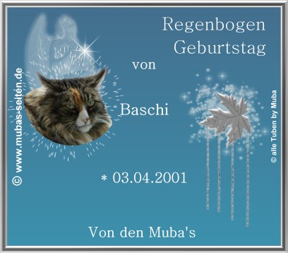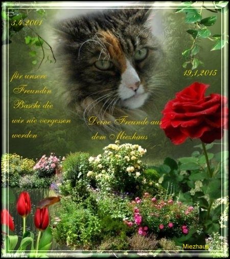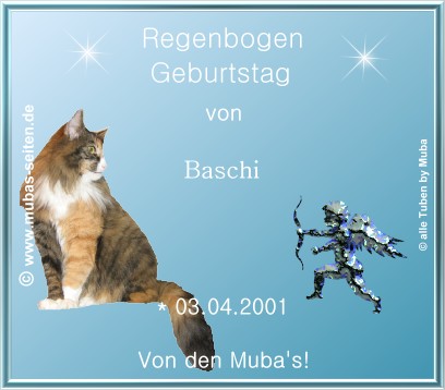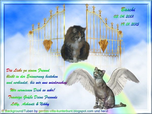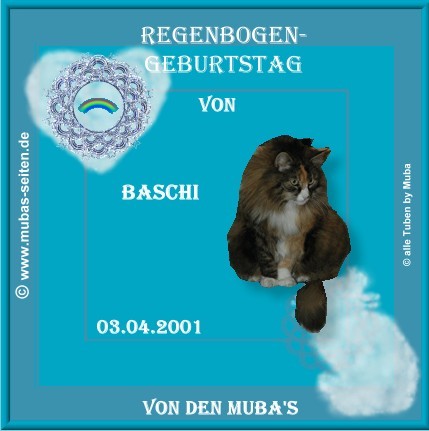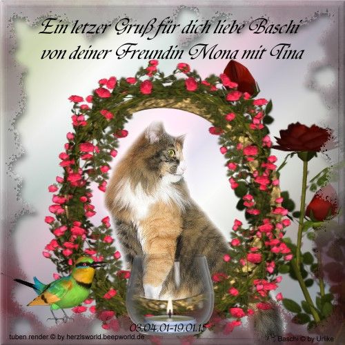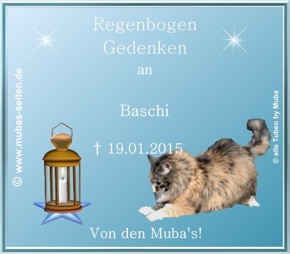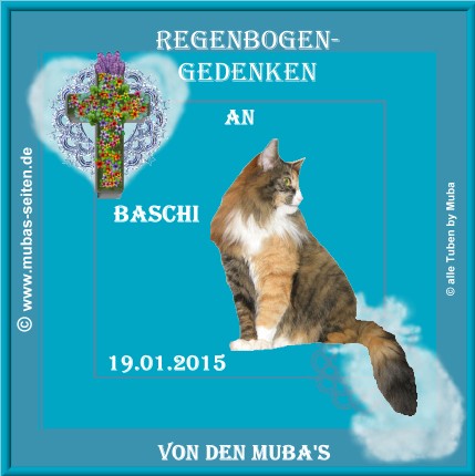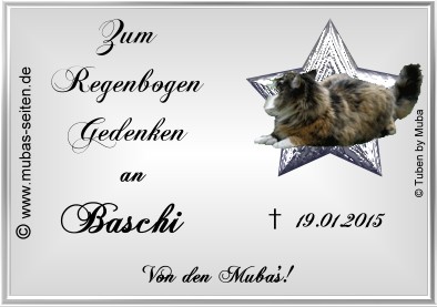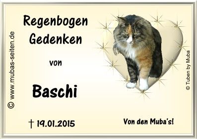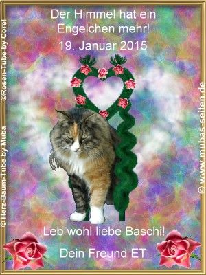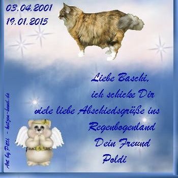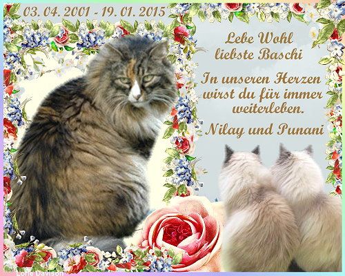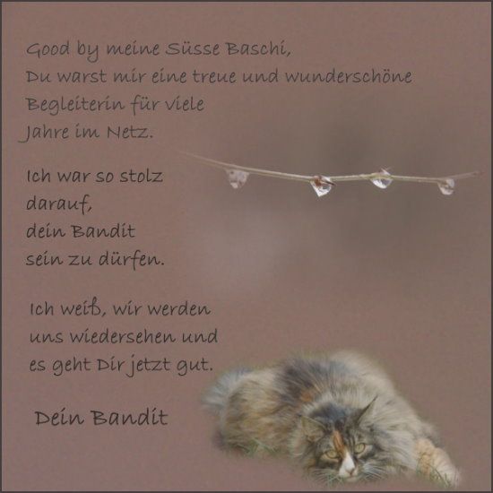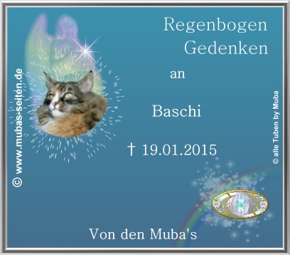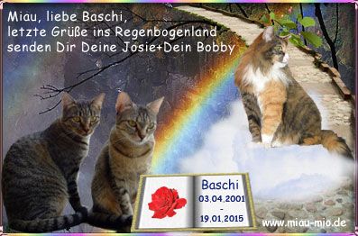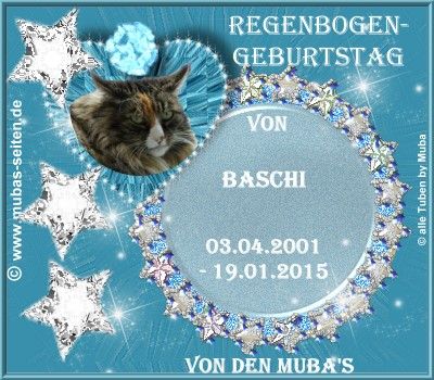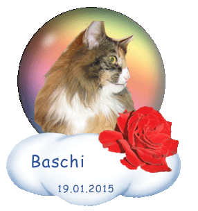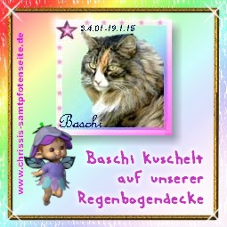 Fast 14 Jahre lebte sie mit uns, fest verwoben mit vielen Erinnerungen und Erlebnissen in dieser langen Zeit. Am Tag ihres Einzugs verschwand sie sofort unter einem Schrank und Cheyenne, der sich freute nun endlich eine Spielgefährtin zu haben, lagerte 2 Tage davor. Irgendwann ist er wohl stinkig auf diese kleine widerspenstige Maus geworden und als Baschi endlich unter dem Schrank hervorkam, da hat er sie erstmal ordentlich verprügelt. Damit war das Verhältnis zu den Katern geklärt.