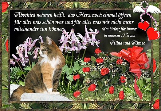 Und nun ist die widerspenstige Süße nicht mehr da. Wir vermissen sie sehr unsere kleine immer schnell zum Zetern bereite Maus, die auch unglaublich schmusig sein konnte. Ich wünsche ihrer kleinen Seele eine gute Reise in ihr neues Land wo auch immer es sein mag.