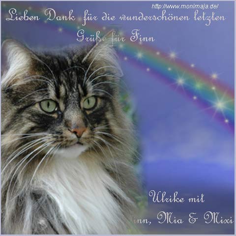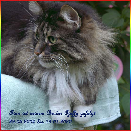Mein Finnemoy. Du hättest beschlossen, selbst zu bestimmen wann du gehen willst. Wir hatten gehofft, du würdest noch eine ganze lange Weile bei uns bleiben können. Du fehlst oder besser, ihr beide du und Tjoffy fehlt uns ganz schrecklich. Unsere Liebe begleitet dich wo immer du auch bist |