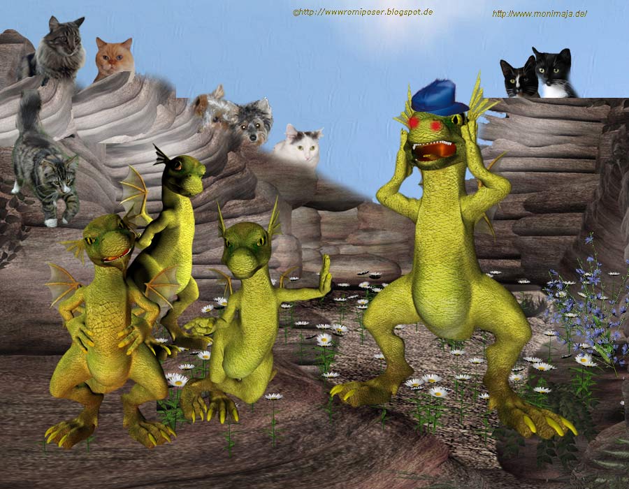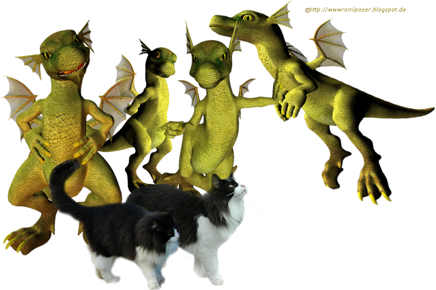 rufen. Grmmphhhfff . Ok Cheffe, wir passen jetzt besser auf. aber diese kleinen Pelztiere sind doch einfach zu putzig.....NEIN, nix putzig, das ist eine zahlende Geburtstagsgesellschaft. Vom Erlös holen wir unser Futter und wir brauchen auch für die Kindernester neues Holz. Cheffe regt sich immer mehr auf, seine Augen leuchten schon feuerrot, er steht kurz vorm Feuerspucken und dann.... .... guck mal Cheffe da kommt einer dieser putzigen Pelztiere angelaufen. Und da oben sind noch viel mehr. Dem Cheffe geht seine blaue Kappe in die Luft und er kann sie gerade noch festhalten. Kinder, wir brauchen einen neuen Plan, krächzt er voller Entsetzen. Ok. Jungs, wir machen ab jetzt eine auf freundliche Drachen und outen uns. Outen? Wat meinste denn Cheffe? Wir geben zu, dass wir lebendig sind, du dusselige Qualmwolke. |