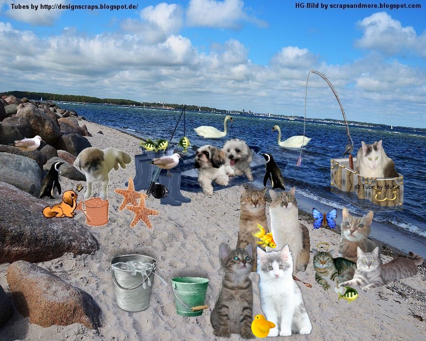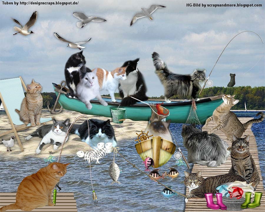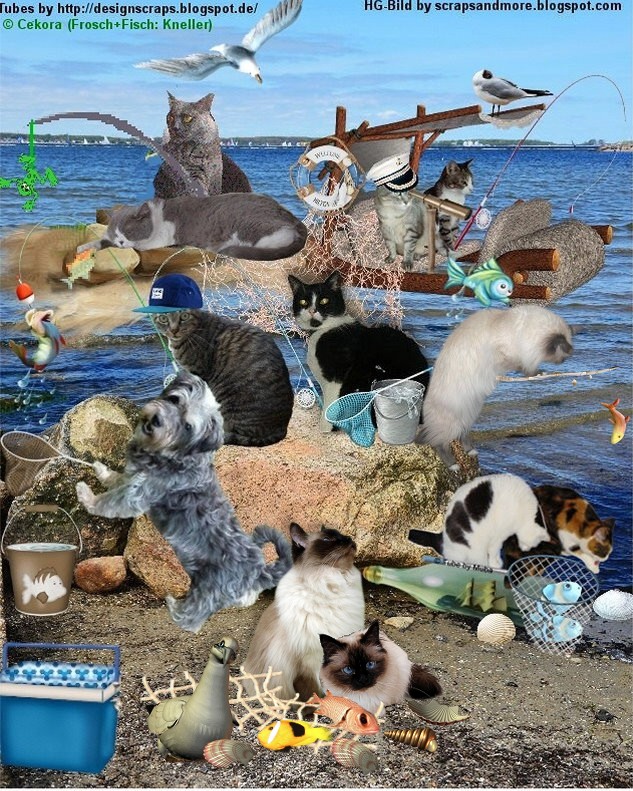 | Waldkatzis. Fischgräte http://gertiede.bplaced.net/index.php, Schuh an Angel: http://romiposer.blogspot..com; Fische aus PI; Angel,Netz, Eimer http://galeriejackie.blogspot.de; Babsy und Urmel: Liegestuhl, Möwen, Anker by www.littledesign.de Bobby, Mona und Josie: by www.littledesign.de;Sally, Ole und Pino: Seepferdchen aus Corel PI |