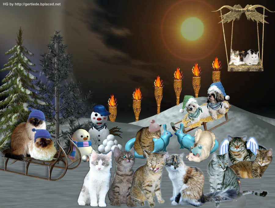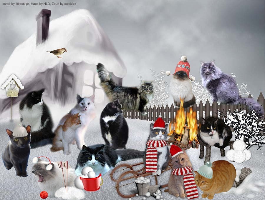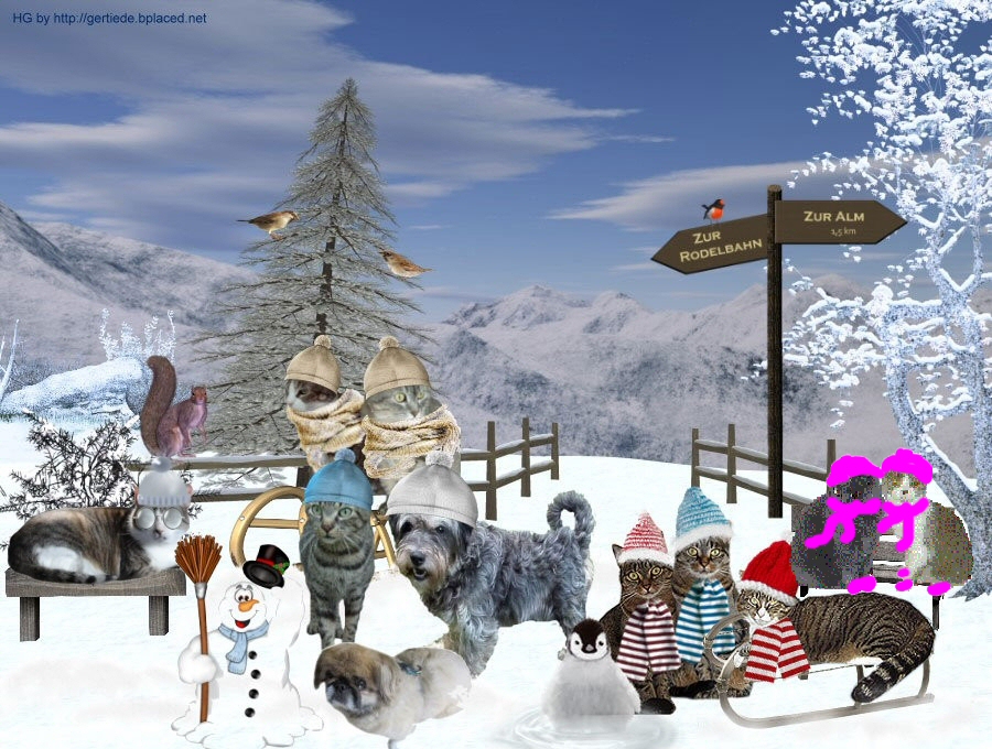 | Teilnehmer und Copyrights: Waldkatzen: Material (c) Corel, Luis: Strauch Schneebälle, Vogel (c) http://oddments.laguna-azul.at, Babsy & Urmel: Material by littledesign, Nilay & Punani Nilays Mütze, Punanis Ohrenschützer, der kleine rote Ball und die Skistöcke (c)http://shop.scrapbookgraphics.com/emeto-designs/, Ashanti & Rocky Mützen (c) by MuBa |