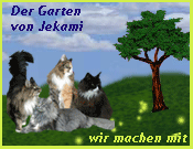 Herzlich willkommen bei Jekami. Als wir im Frühling 2012 den Garten von Jekami ins www schickten hätten wir nie gedacht, dass soo viele von euch daran Spaß haben und auch so viele von euch mitmachen. Inzwischen sind schon einige Patenschaften übernommen worden und hier könnt ihr alle anschauen. Wenn jemand Lust hat, auch eine Patenschaft zu übernehmen, der kann sich gerne bei uns oder auch bei den jeweils laufenden Patenschaftsinhaber melden. Bisherige Paten: Linus und Sassy, Merlin, Josie und Bobby, Tessi und Co, ( früher Deppi und Co,) Sally, Biene und Luis, das Miezhaus, Babsy und UrmelSally, ET, Filou und Flocke, Schugercats mit Eny,Sally mir Ole und Pino Luis, Finja und Lien , Jella und Jacko