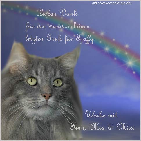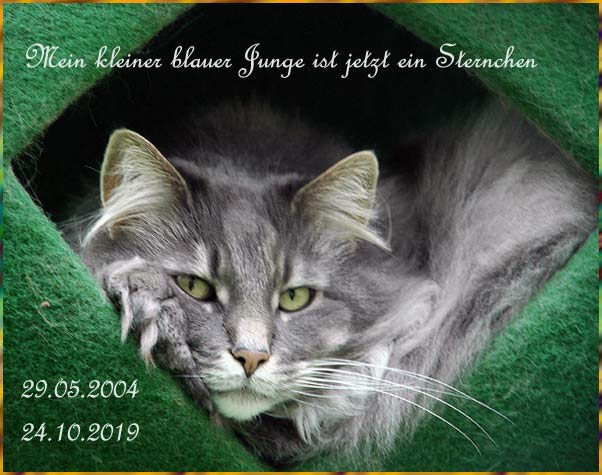 Tjoffy ist heute friedlich und ohne Angst in meinen Händen eingeschlafen. Wir sind sehr traurig aber mein kleiner blauer Junge hatte keine Lebenskraft mehr. Jetzt liegt er neben seinem Freund Cheyenne.Wir denken an all die schönen Tage mit ihm und schicken all unsere Liebe für unseren blauen Sonnenschein mit auf seine Reise. |