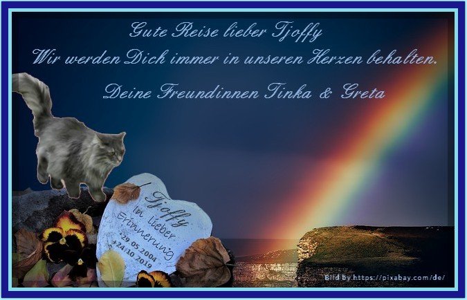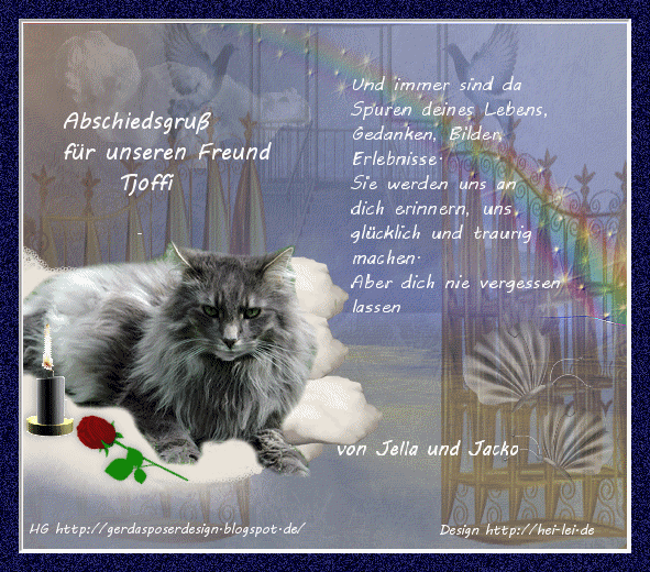 Liebe Ulrike! Wir sind sehr traurig, obwohl es ja fast zu erwarten war. Ich mache nicht viel Worte und einen bildlichen Gruss kann ich auch nicht schicken, aber wir fühlen mit Dir! Liebe Grüße schicken Dir Christa und Cindy |