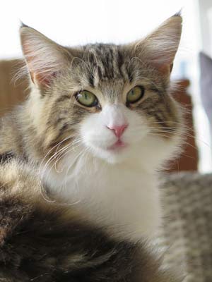 Ich bin Afjord`s Flying Kangaroo, genannt Fly. Ich bin am 16.4.2020 geboren und am 11.7.2020 in mein neues Zuhause eingezogen. Uihh da waren schon 3 große Katzen und dann habe ich erst einen Tag später gemerkt, der Joschi ist ja auch noch ein Junge, der sieht nur so groß aus. Ich soll eine ganz coole Socke sein und bisher noch kein so großes Talent in Sachen klettern oder hochspringen sein. Aber ich übe fleißig. Mit dem Joschi kann ich supertoll raufen, toben und Blödsinn machen. Wir sind voll gute Freunde und futtern sogar aus einem Napf obwohl Joschis Kopf schon recht groß ist. Unsere Leute haben uns versprochen, die holen einen größeren Napf für uns damit wir weiter zusammen futtern können.